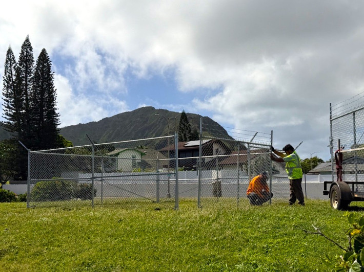 On the lawn near the entrance to the Kalama Village Shopping Center in Maunalua on Kamehameha Schools lands in East Honolulu, workers put the final touches on a 400-square-foot chain-link enclosure that will house a marvel of technology intended to help keep this community safe.
