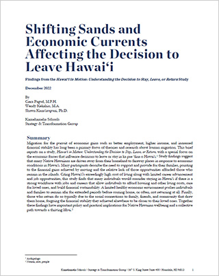 This report examines the economic forces, such as job and career opportunities, higher income and financial stability, cost of living, and housing and homeownership, that influence decisions to leave or stay in ka pae ‘āina o Hawai‘i.