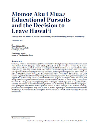 This report examines education, compulsory and post-secondary, as a factor influencing the decision to leave or stay in Hawai‘i. Education is a decision many face after high school graduation and a key driver of outmigration from the islands.