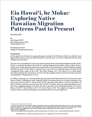 This report discusses Native Hawaiian migration from a cultural perspective by exploring historical accounts of migration, migration theories, and existing research on Native Hawaiian migration experiences.