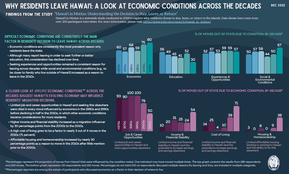 This infographic takes a closer look at how economics, education, social ties, and other experiences and opportunities afar influence decisions to leave Hawai‘i across time.